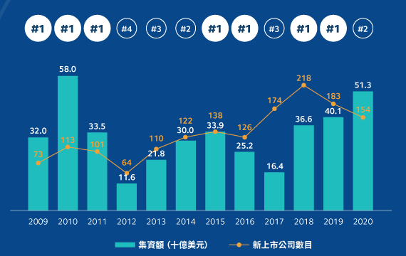 2020年盡管環球市場波動異常,但是港交所的一級市場仍領先全球IPO集資榜,共有154家公司在香港交易所上市,2020年首次公開招股集資額位列全球第二,集資金額達3,975億港元,是2010年以來最高,這主要得益于內地紛紛赴港企業上市。