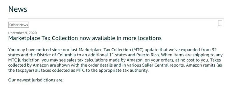 近日,亞馬遜美國站發布了一則有關在更多地區商城征稅(Marketplace Tax Collection)的公告,新增了11個需要由亞馬遜代收代繳銷售稅的地區。