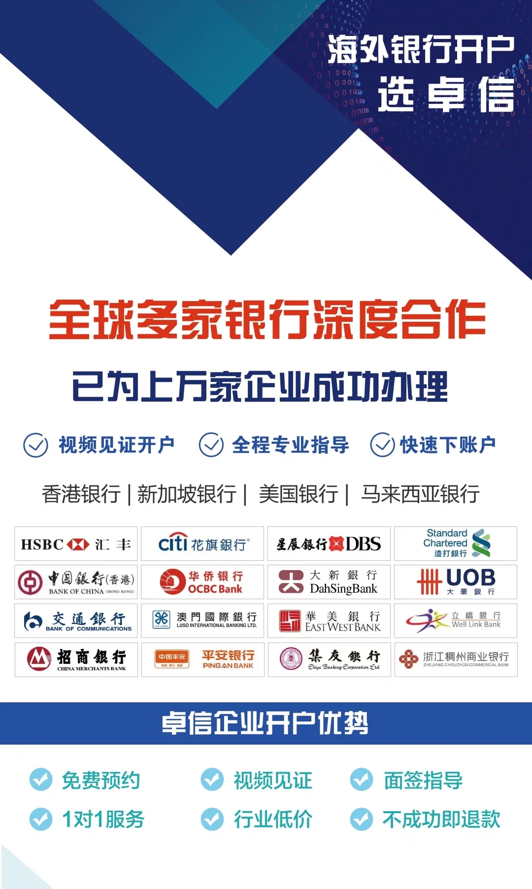 卓信擁有多年開戶經(jīng)驗(yàn),與多家銀行有良好合作關(guān)系,為客戶提供免費(fèi)開戶預(yù)約服務(wù),國內(nèi)視頻見證開戶,全程保駕護(hù)航,歡迎隨時(shí)聯(lián)系!