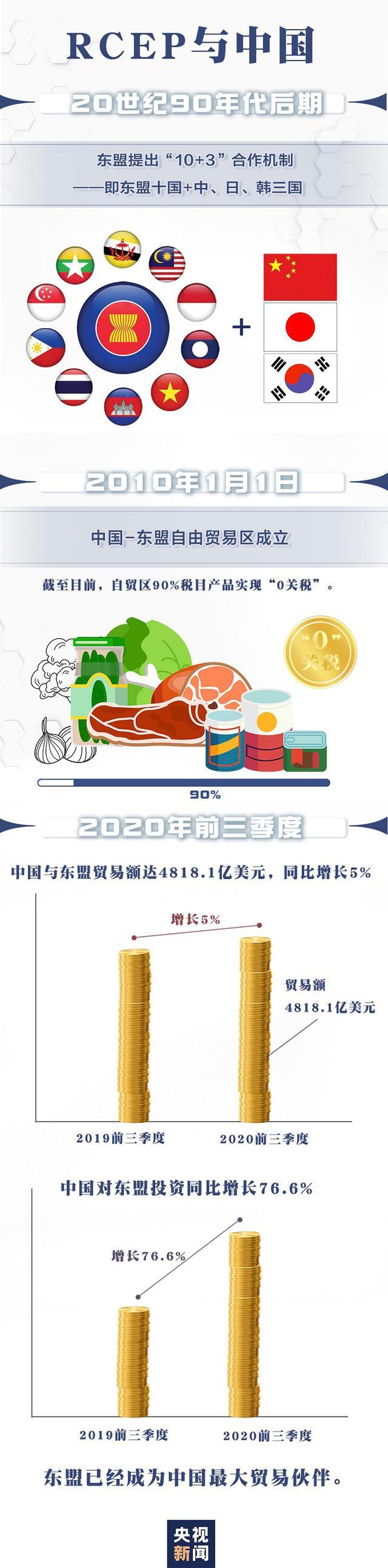 11月15日,區域全面經濟伙伴關系協定(RCEP)正式簽署,包括東盟10國+5國(中國、日本、韓國、澳大利亞、新西蘭),涵蓋全球30%以上人口、GDP、貿易和投資的最大自貿區誕生,參與國之間超過90%貨物貿易將實現零關稅。