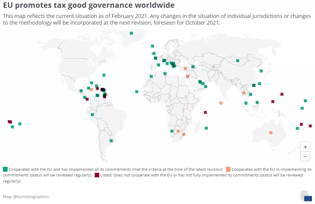 這份名單包括了世界上沒有就稅收治理問題與歐盟進行建設性對話的轄區,或者沒有履行承諾實施必要的改革以遵守一套客觀的稅收良好治理標準的轄區。