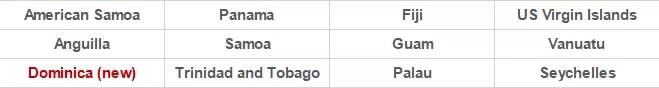 美屬維爾京群島、美屬薩摩亞、安圭拉、多米尼克(新增)、斐濟、關島、帕勞、巴拿馬、薩摩亞、塞舌爾、瓦努阿圖、特立尼達和多巴哥。