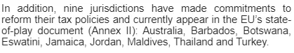 此外,9個司法管轄區已作出改革其稅收政策的承諾,已從非合作名單除名,但仍處于考察階段,包括澳大利亞、巴巴多斯、博茨瓦納、斯瓦蒂尼、牙買加、約旦、馬爾代夫、泰國和土耳其。