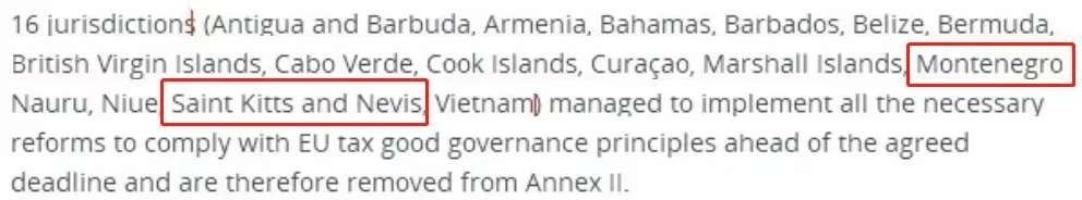 早在2020年2月更新的非合作名單中,就移除了黑山、圣基茨和尼維斯等16個管轄區,這也意味著,目前黑山、圣盧西亞、圣基茨均在歐盟稅收白名單之中。