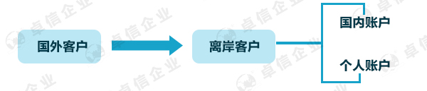 離岸賬號收到國外客戶貨款后,可將成本打給國內進出口公司核銷退稅,利潤可轉個體工商戶結匯。如圖: