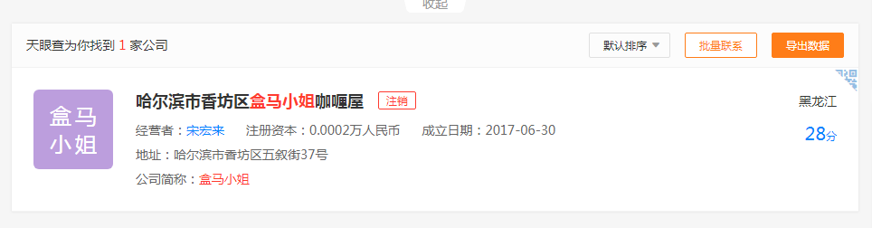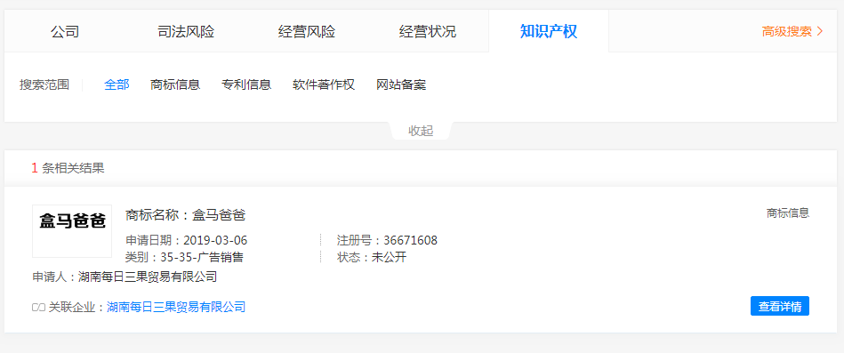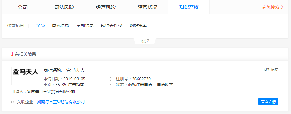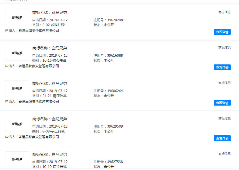 我們通過天眼查發現,“盒馬夫人”、“盒馬爸爸”都是湖南每日三果貿易有限公司注冊,“盒馬兄弟”商標持有人是香港品牌集眾管理有限公司,“盒馬小姐”持有者是哈爾濱市香坊區盒馬小姐咖喱屋,目前該公司顯示已注銷。
