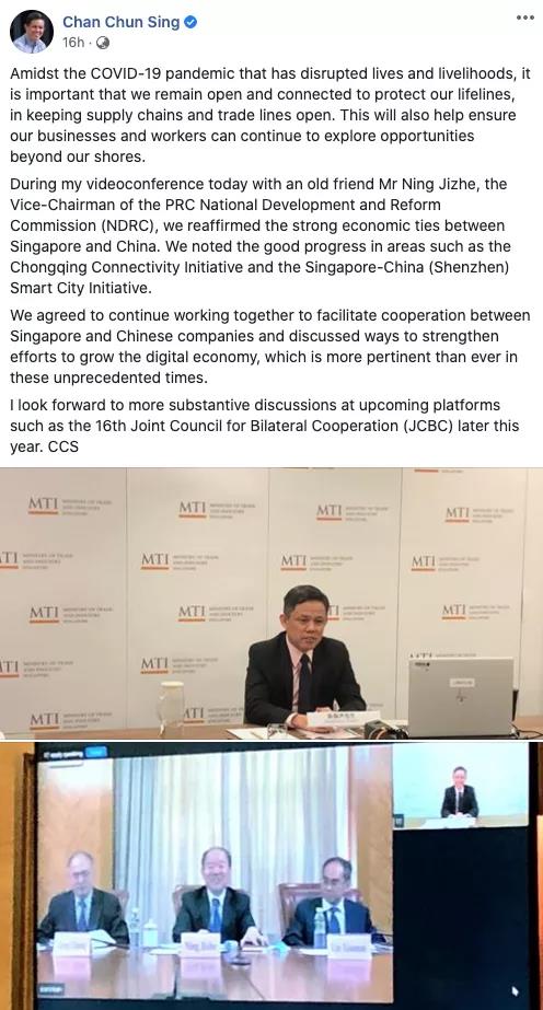 在中國的一帶一路倡議、政府與政府的項目和中新(重慶)互聯互通倡議這一系列新的國際陸海貿易走廊框架下,陳振聲部長肯定了新加坡和中國深厚的經濟聯系。陳振聲部長在視頻會議結束后的臉書發帖表示,新加坡保持開放和連接,從而保護生命線,保持供應鏈和貿易線的開放,是非常重要的。這也將有助于確保新加坡的企業和工人能夠繼續探索海外機會。