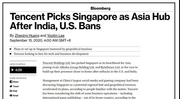 9月15日,繼阿里巴巴、字節跳動之后,騰訊集團也選擇將進軍亞洲其他地區的橋頭堡設立在新加坡。