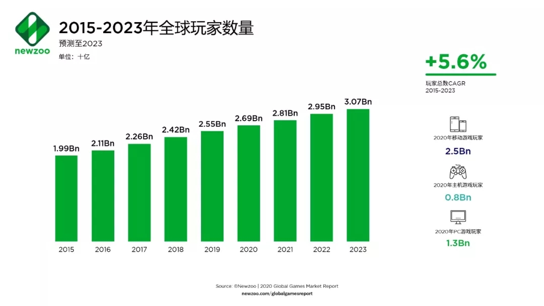 根據Newzoo最新發布的《2020年全球游戲市場報告》顯示,全球游戲市場規模將達1593億美元,同比增長9.3%;全球游戲玩家數量將持續增長,到2023年將超過30億。