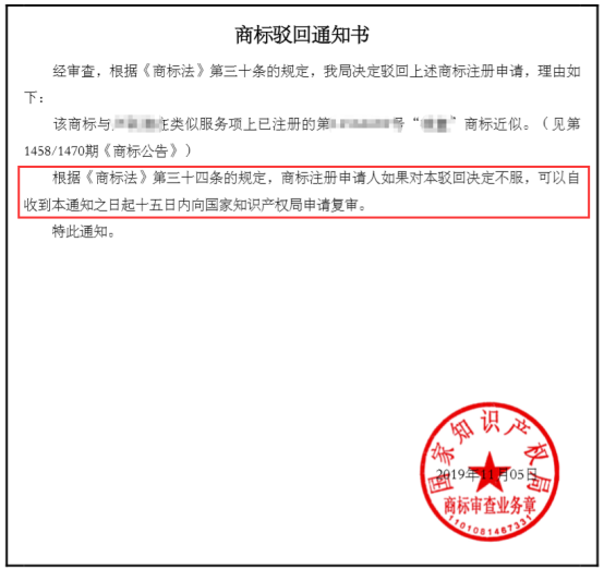 根據《商標法》第三十四條的規定,商標注冊申請人如果對本駁回決定不服,可以自收到本通知之日起十五日內向國家知識產權局申請復審。